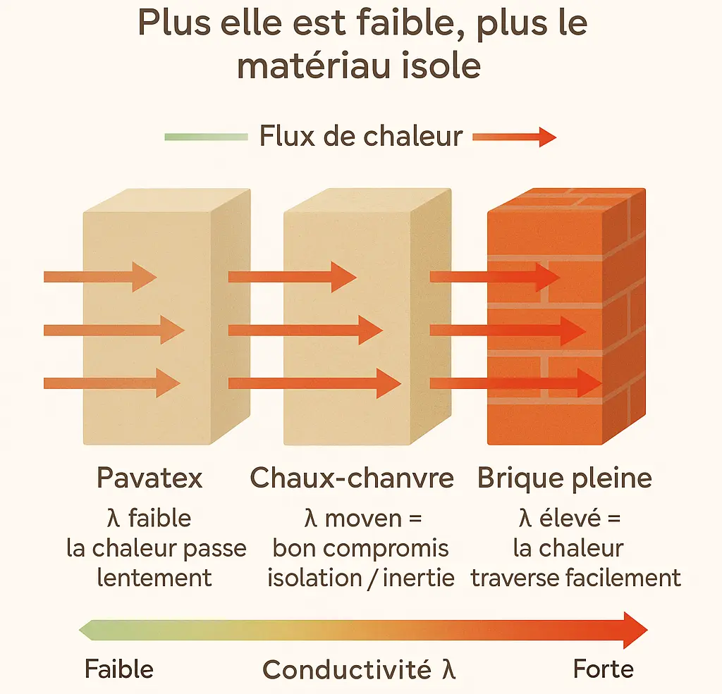 Schéma de conduction : flèches traversant plusieurs matériaux, λ faible ↔ λ élevé.