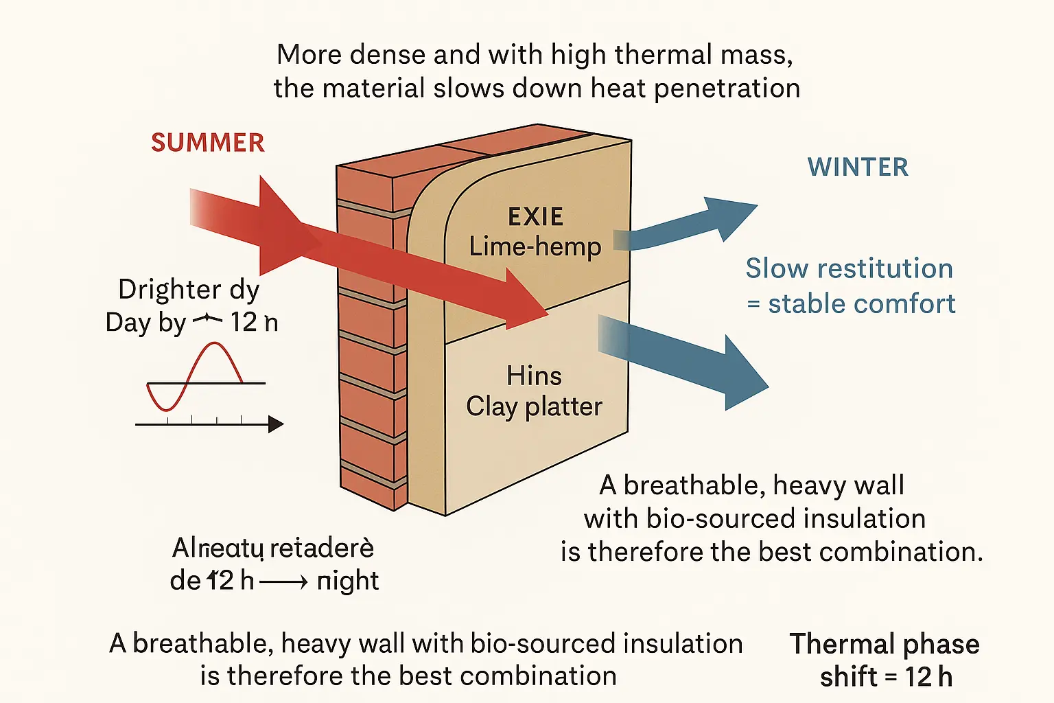 Ces principes expliquent pourquoi une paroi en terre Argilières de Hins, un mur chaux-chanvre EXIE, ou un isolant Pavatex procurent une sensation de confort incomparable, été comme hiver.