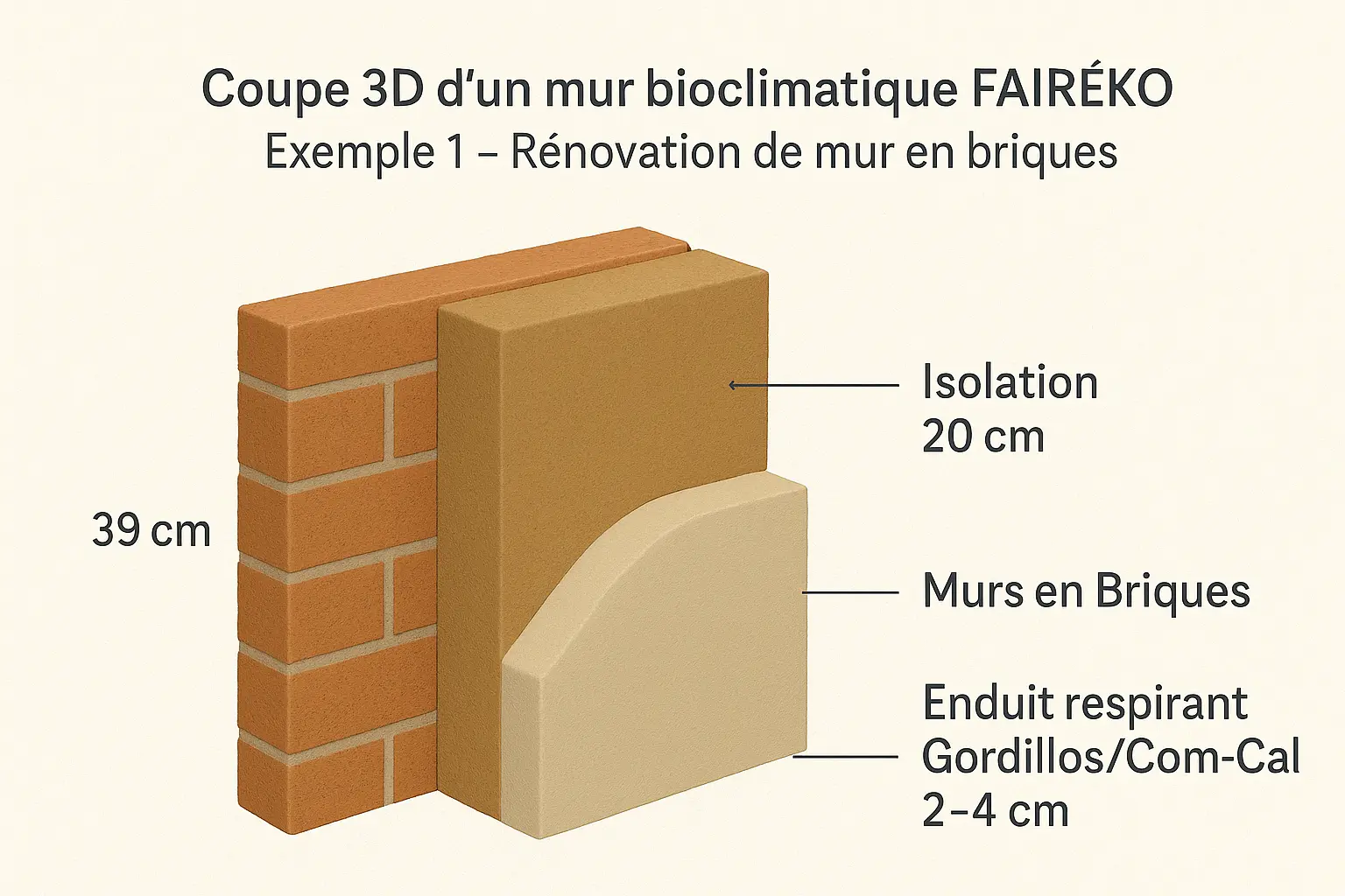Enduit respirant Gordillos/Com-Cal → Murs en Briques → Pavatex Isolair/Exie/PiHemp Wall → finition StucClay/Hins Materre/Com-Cal.